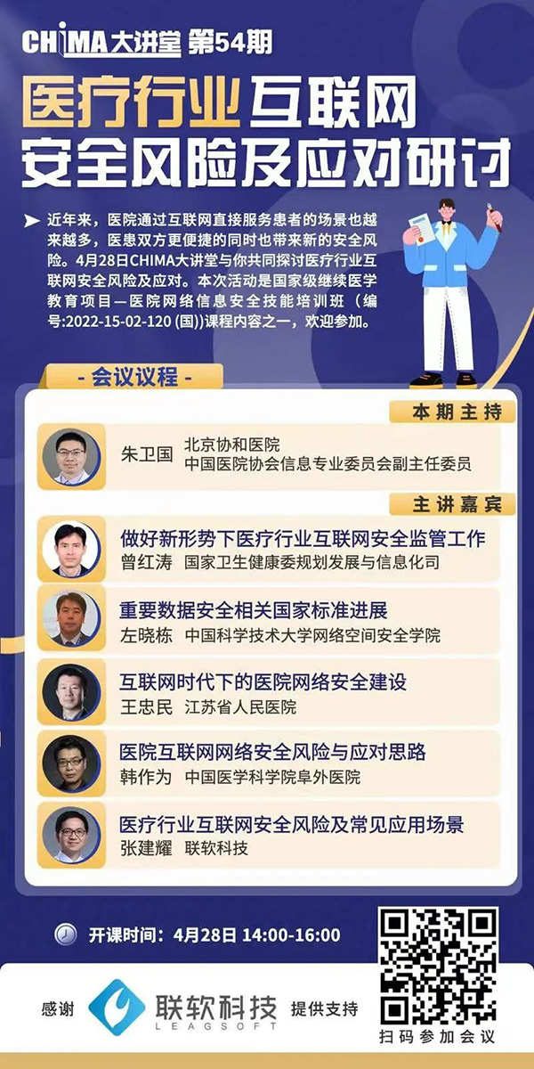 为加强健康医疗行业从业人员网络安全相关培训,切实提升相关人员的网络安全意识,落实网络安全责任,今天14:00开讲的CHIMA大讲堂举办医疗行业互联网安全风险及应对研讨会,邀请中国医院协会信息专业委员会(CHIMA)副主任委员朱卫国担任主持人,国家卫生健康委规划发展与信息化司调研员曾红涛、中国科学技术大学网络空间安全学院教授左晓栋、江苏省人民医院信息处处长王忠民、中国医学科学院阜外医院信息中心副主任韩作为、联软科技高级副总裁张建耀等演讲嘉宾共同研讨医疗行业互联网安全风险及应对。
