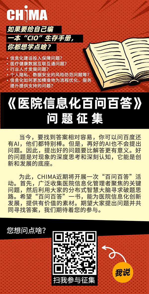 为此,CHIMA近期将开展一次“百问百答”活动。首先,广泛收集医院信息化管理者聚焦的关键问题,然后利用大家的分布式智慧大脑寻求破题思路。希望“百问百答”一书,能为医院信息化创新发展,提供有价值的素材,期望大家提出问题并共同寻找答案。我们期待着您的参与。