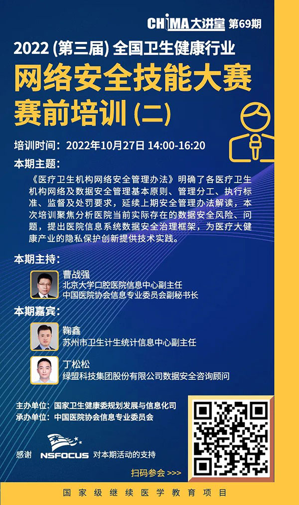 《医疗卫生机构网络安全管理办法》明确了各医疗卫生机构网络及数据安全管理基本原则、管理分工、执行标准、监督及处罚要求。10月27日14:00开讲的CHIMA大讲堂将举办2022(第三届)全国卫生健康行业网络安全技能大赛赛前培训(二),由CHIMA副秘书长、北京大学口腔医院信息中心副主任曹战强担任主持人,苏州市卫生计生统计信息中心副主任鞠鑫、绿盟科技集团股份有限公司数据安全咨询顾问丁松松等专家担任演讲嘉宾。本次培训延续上期安全管理办法解读,聚焦分析医院当前实际存在的数据安全风险、问题,提出医院信息系统数据安全治理框架,为医疗大健康产业的隐私保护创新提供技术实践。