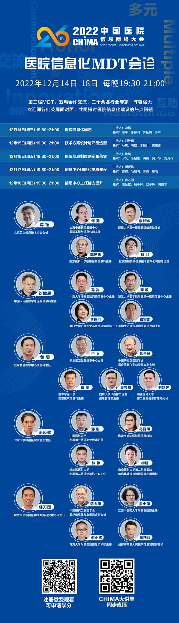 CHIMA 2022医院信息化MDT会诊今晚19:30拉开帷幕,欢迎关注