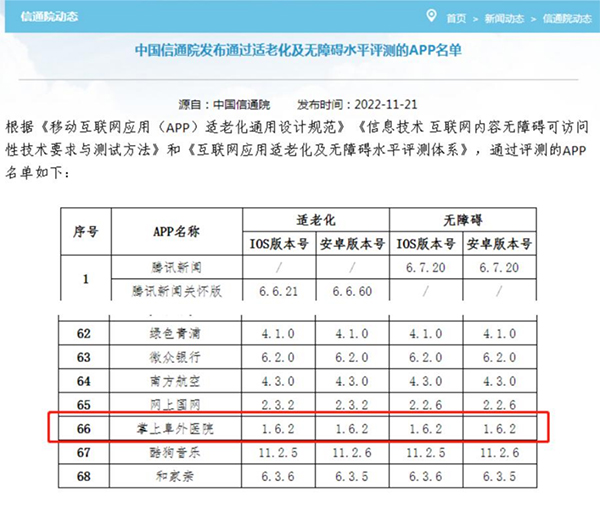 近期,中国信息通信研究院发布了我国全行业通过适老化及无障碍水平评测的APP名单,阜外医院成为全国唯一通过评测认证的医疗机构。