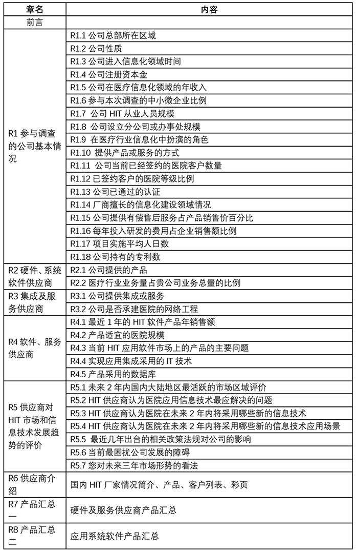 《2021-2022年度卫生信息技术产品及服务供应商调查报告》共收到来自卫生信息技术相关厂商的公司负责人、产品负责人或市场负责人反馈的调查问卷153份,经数据整理后最终保留151份有效问卷。最终报告内容包括:公司基本情况、硬件及系统软件供应商、集成及服务供应商、软件及服务供应商、供应商对HIT市场和信息技术发展趋势的评价、厂商介绍彩页汇总、硬件及服务供应商产品汇总、应用系统软件产品汇总,共8个部分。