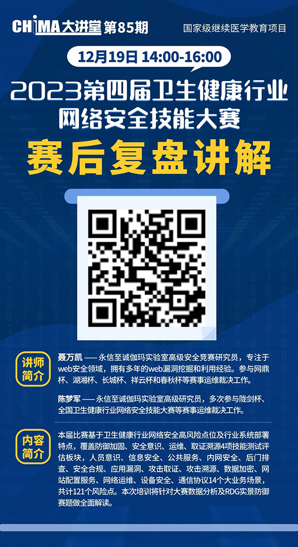 CHIMA大讲堂为国家级继续医学教育项目,本期为“网络信息安全技能培训班”课程之一,编号:2023-15-02-318(国),修够学时可于年底申请学分。欢迎参加。