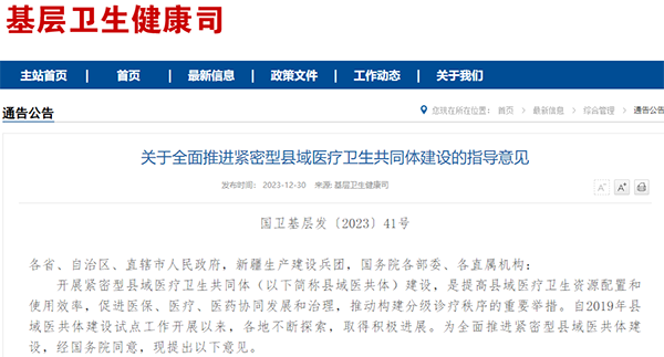 十部门联合印发《关于全面推进紧密型县域医疗卫生共同体建设的指导意见》