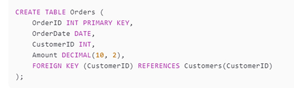 以常用的关系数据库来说,外键(Foreign Key)不仅是在两个表之间建立链接,还是用于维护表之间数据完整性的约束。假设有两个表:Customers和Orders。Customers表包含客户信息,Customer ID为主键列,而 Orders 表包含订单信息。从Orders表定义脚本可知,FOREIGN KEY (CustomerID) 指定了 Orders表中的 CustomerID 列为外键,用于链接客户与订单的关系。