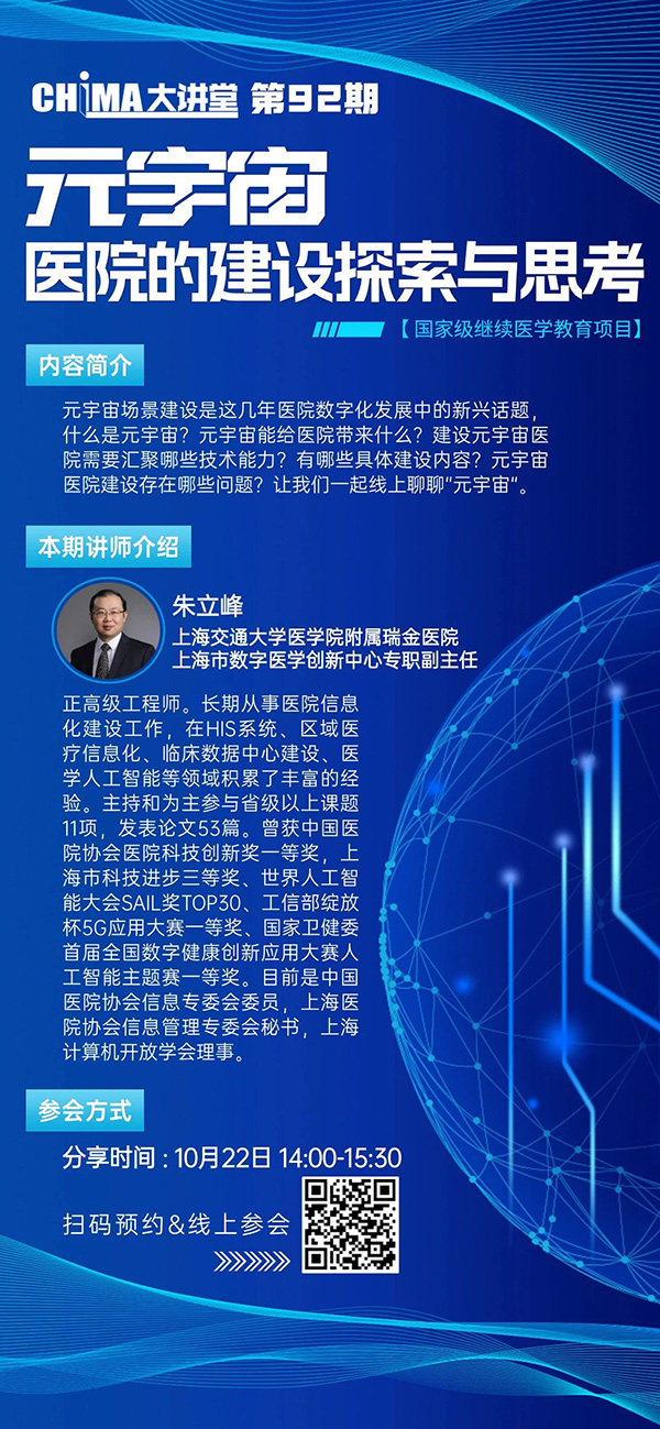 CHIMA大讲堂为国家级继续医学教育项目,本期为“医院信息化建设培训班”课程之一,编号:2024-15-02-369(国),修够学时可于年底申请学分。