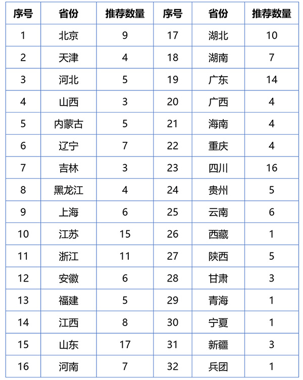 各省(区、市)及兵团推荐数量分配表