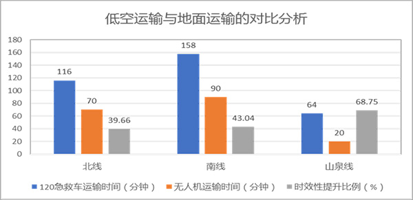 2.医院时效性提升:无人机低空配送显著提高了医疗物资的配送时效性,提升了医疗服务的效率和质量。低空运输与地面运输的对比分析:平均时效性提升41.61%,以山泉镇为例,无人机运输单程仅需10分钟,相比传统汽车运输的时间快22分钟,时间缩短了近68%。