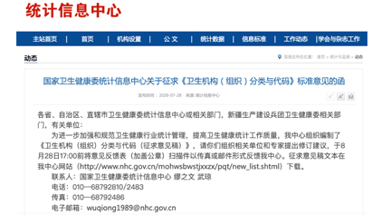 国家卫生健康委统计信息中心发布征求《卫生机构(组织)分类与代码》标准意见的函