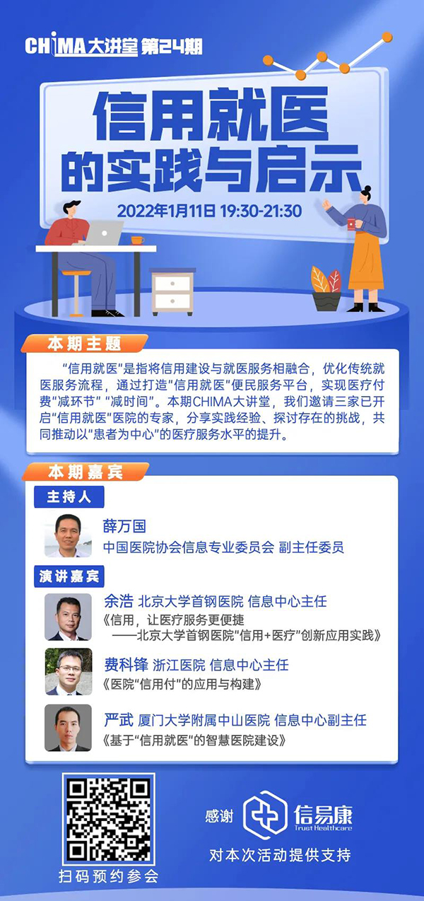 “信用就医”是指将信用建设与就医服务相融合,优化传统就医服务流程,通过打造“信用就医”便民服务平台,实现医疗付费“减环节”“减时间”的目标。今晚19:30开讲的CHIMA大讲堂第24期,特邀CHIMA副主任委员薛万国担任主持人,邀请三家已开启“信用就医”医院的专家,分享实践经验,探讨存在的挑战,共同推动以“患者为中心”的医疗服务水平的提升。诚邀参加。